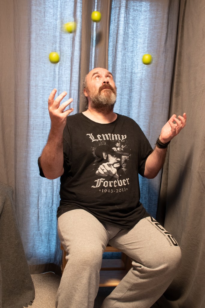 I worked from the basis of a reference photograph of the chair in the background. I then took another shot of myself in pose. I then took a number of photographs of an apple suspended in the air using thread and a wooden stick. I moved then moved the apple around so that I could obtain shots of the apple in differing positions as I felt the light on the apple had to be consistent with the position of the apple.