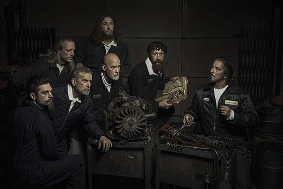 Fabris has transplanted the anatomy lesson, taking it from the Dutch anatomy classroom, to the American Midwest garage workshop. Fabris, in wanting ‘to take them out of their original context, yet maintain their essence’, has kept the lighting as close to Rembrandt’s painting as possible, whilst still making the subjects visible and distinctive.