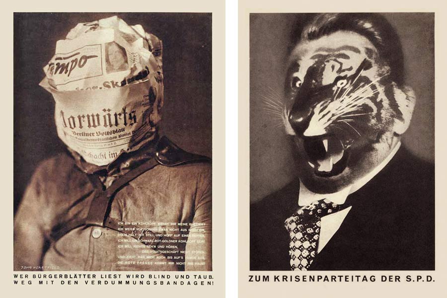For example John Heartfield with “Whoever Reads Bourgeois Newspapers Becomes Blind and Deaf: Away with These Stultifying Bandages!” (1930) and “Zum Krisen-Parteitag der SPD” (1931)